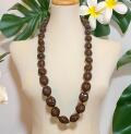 ククイナッツを1つ1つ丁寧に磨き上げ、職人により編み込まれた、上質なブラウンククイナッツレイです。当店のククイナッツレイは、納品前に1本1本、目視で確認をし、お客様がご満足頂ける様な、綺麗な商品の発送を心掛けております。長さは、約88cmから92cm(上部紐を除くククイナッツ部分の長さ)となっております。